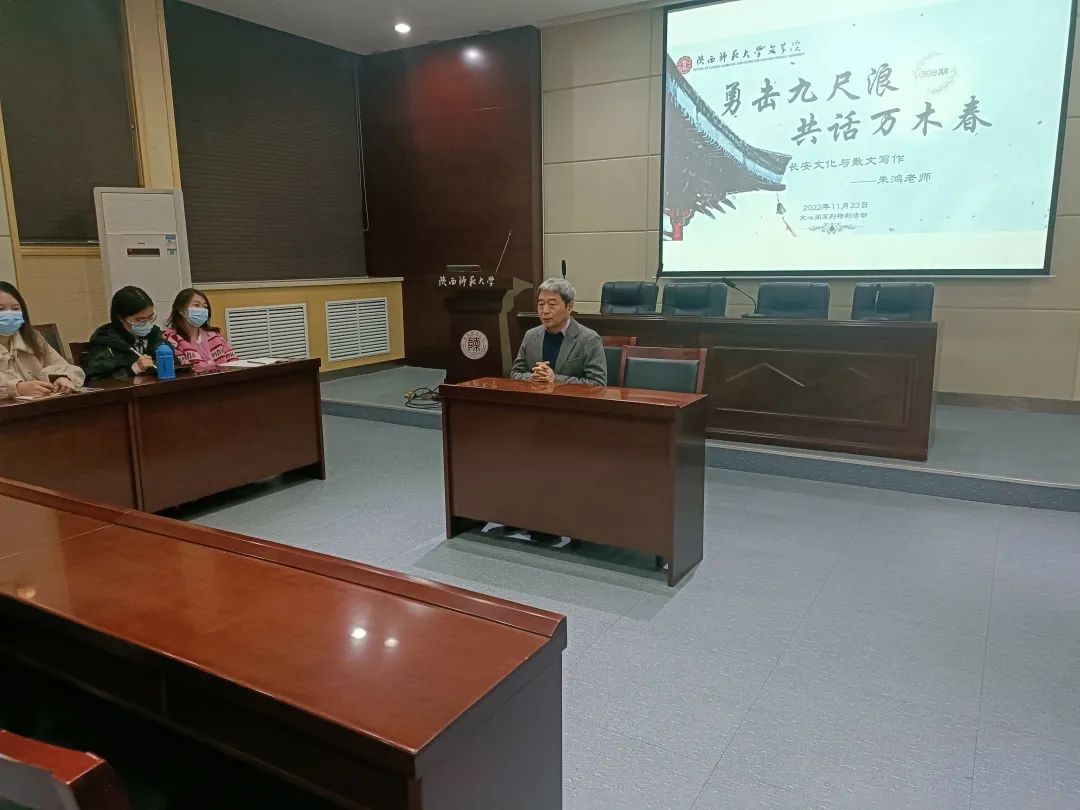 11月23日晚,本学期第6期(总第308期)文心阁师生面对面交流活动在文汇楼A段111报告厅顺利举行,bevictor伟德官网教授、写作教研室的朱鸿老师应邀参加。本次活动中,朱老师围绕“长安文化与散文写作”这一主题,与同学们展开了探讨,整场交流活动轻松而有趣,同学们受益匪浅。