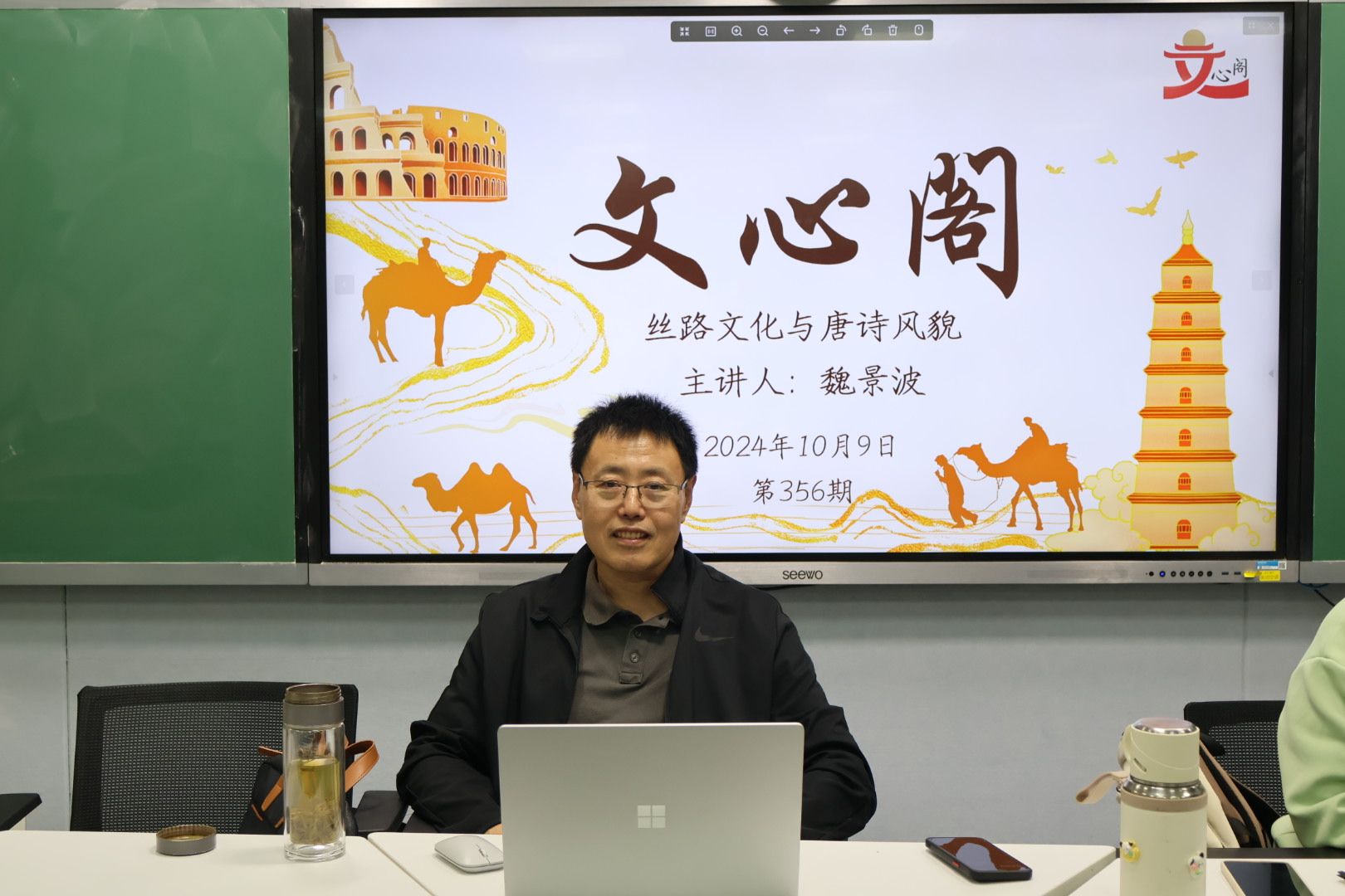 10月9日,本学期第3期(总第356期)文心阁活动在长安校区文汇楼A段306智慧教室成功举办。bevictor伟德官网教授、中国古代文学教研室的魏景波老师,以“丝路文化与唐诗风貌”为主题,与同学们展开分享交流。