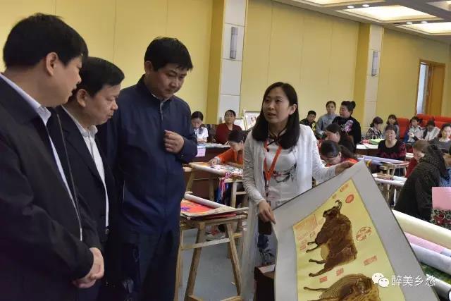 唐利如副厅长、党怀兴副校长一行来到学员作品展位前,一边欣赏学员作品,一边与学员们亲切交谈,学员们跟据这一个月所学到的知识,向领导们汇报每件绣品的内涵、寓意、价值和意义,并手把手地向前来参观的大学生丶教师丶离退休老干部等传授刺绣技艺,显示了充分的文化自信和自觉。