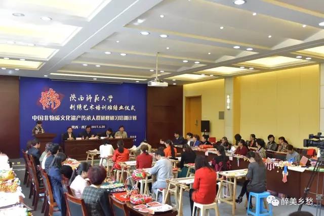 2017年4月20日,中国非物质文化遗产传承人群研修研习培训计划陕西师范大学第四期培训班(刺绣)结业仪式暨学员作品展览在陕西师范大学长安校区文汇楼111会议厅举行。陕西省文化厅副厅长唐利如、非物质文化遗产处副处长刘卫东,陕西师范大学副校长党怀兴等出席结业仪式、参观学员们的作品展览,并向学员颁发了结业证书。
