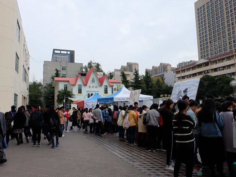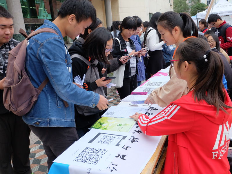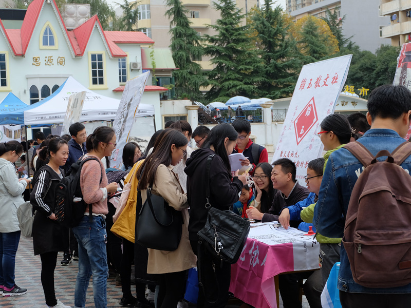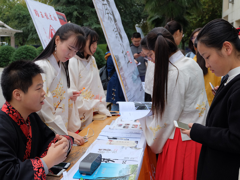 早上七点,各个社团的宣传负责人陆续进入指定位置,为同学们的到来紧张而积极地准备着。上午九点,各个社团的活动陆续展开。砚友书画社笔走龙蛇,与墨为友、与古为徒,挥洒青春风采;长风文学社的学长学姐们耐心的为大一的同学们解答着有关文学方面的知识;秦风诗社古风古韵,用低吟浅唱、长赋短歌吸引着学生的目光;雕龙文化协会借文入胜,品读经典永恒;电影爱好者协会同道者众,各抒己见,好不热闹;入戏话剧社则是能文能武,亦动亦静,引得笑声连连;雏玉散文社用一首首清新优雅的三行诗传达出了温柔缱卷的文学意味。同学们积极地参与到社团举行的活动中,抽签答题,写散文诗,更有一些同学身着汉服,为喷泉广场更添一抹盛唐风情。