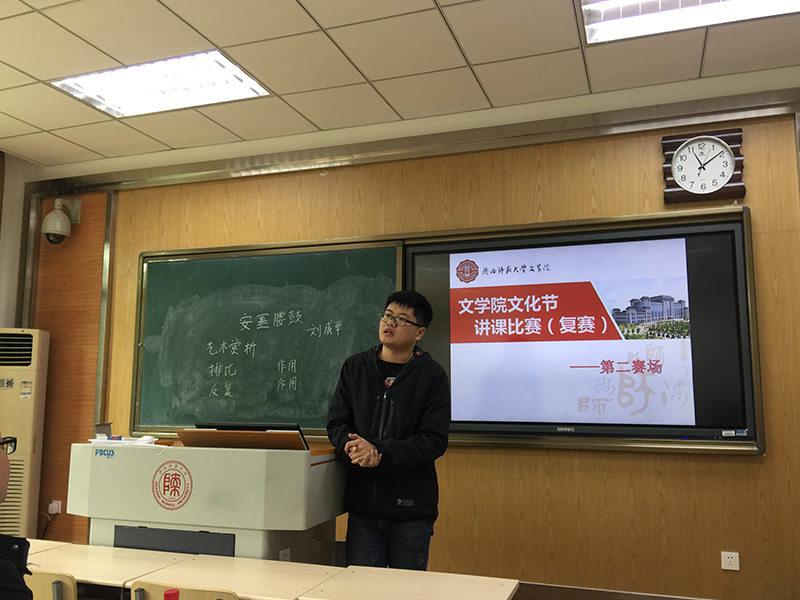 10月15日决赛阶段,李军亮老师、现代汉语教研室的李虹老师、师资博士后黄政老师出席并担任评委,选手们在决赛期间可以运用ppt或其他教学辅助工具。选手们熟练地运用导学案、多媒体等新型教学模式,极大地调动了学习对象的学习积极性,突出学生在教学中的主体地位,在逐步从学生向教师角色的转变方面作了较为有益的尝试。评委老师对选手们的表现进行了精彩独到的点评,各位选手和在场的同学们都受益匪浅。全部选手结束课堂展示后,李军亮老师对此次比赛做了总结性的发言。李老师充分肯定了选手们的优点,也给同学们提出了一些意见,如课堂内容应有清晰的思路,详略得当,着重说教学过程;对待相应的教学对象,不仅要有学科的专业理念,更要注重不同年龄段学生的学习特点,以此来调整教学内容的深度与层次;同时,也建议同学们制作PPT时注重思路和条理。同学们纷纷表示收获颇丰。