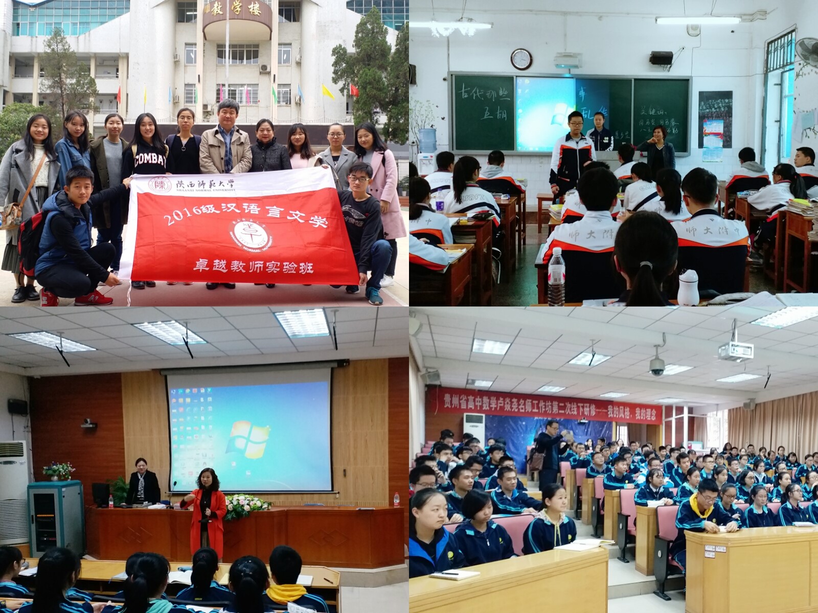 (通讯员:王静茹)10月25日至27日,我校我院2016级汉语言文学专业卓越教师实验班十位同学在苏仲乐副院长和郭迎春老师的带领下,前往贵州省贵阳、安顺两市进行为期三天的交流学习活动。在两位老师的带领下,卓越班一行人先后参观了贵州师范大学附属中学、贵阳市第二中学和安顺市第一高级中学三所中学,同学们深入课堂一线,观摩中学教学,积累了宝贵经验。
