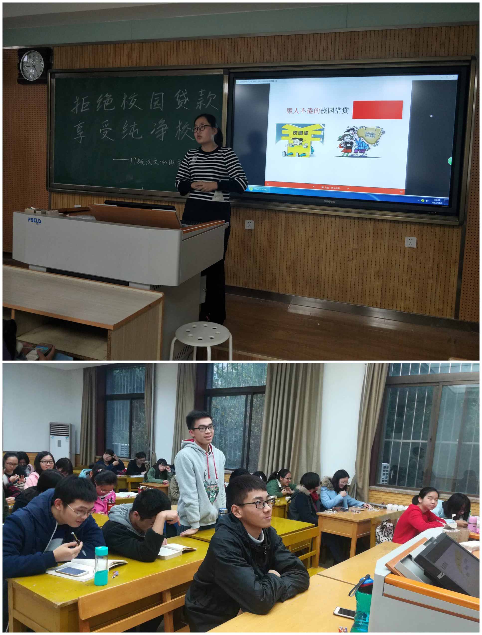 2015级本科生活动主要采取集中教育和班级自主学习两种形式。首先,程海峰老师通过周末晚点名,向大家介绍了网贷的原理,并对其危害性,进行了具体的讲解和生动的说明,让同学们认识到网上贷款对社会和校园的危害,告诫同学们加强对网上贷款信息的警惕,拒绝参与网贷的任何环节;平时的学习和生活中,也要提高防范意识,认真学习经济法和民法的相关条知识,加强自我保护能力。通过聆听讲解,同学们初步了解了网贷的原理和危害,程老师给每个班制订了学习任务,要求班委组织大家认真学习。接下来的一周中,各班纷纷开展了以贷款风险及网络传销防范为主题的学习活动,辅导员秦亚坤老师了参加了各班的班会。班会上,各班班委用精心准备的文字材料和视频信息向同学们讲解了网贷的危害,并对相关的法律法规做了认真的宣讲和解读,也有很多同学纷纷上台发言,分享自己的学习体会。秦亚坤老师对班委的精心准备和同学们真诚的分享表示肯定,同时也结合工作中的事例再次强调了网贷的危害,并鼓励大家要学会用法律的武器保护自己。