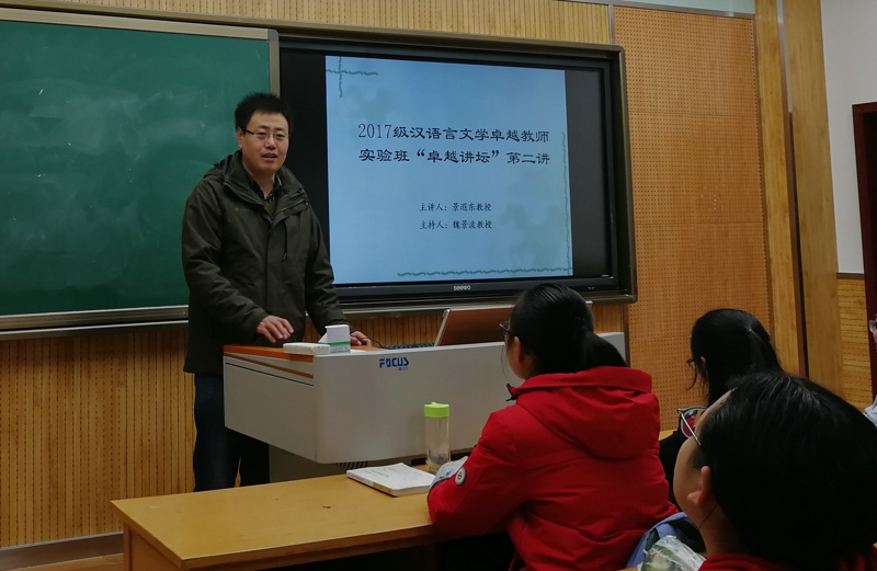 (通讯员:李思颖)2017年11月17日上午8:00,2017级汉语言文学卓越教师实验班在教学八楼8504教室迎来了“卓越讲坛” 第二讲。本次讲座的主题为“传统文化中的修身理念及其现代意义”,由湖北师范大学bevictor伟德官网院长景遐东教授主讲,卓越班项目主任魏景波教授主持。