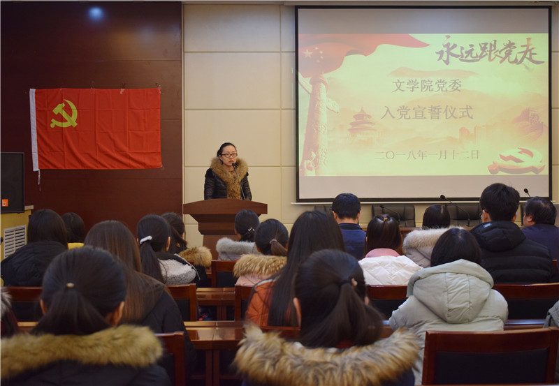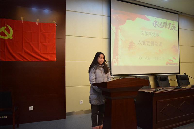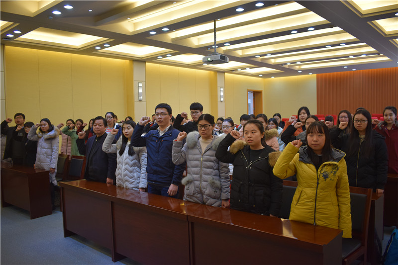 鲜红的党旗,醒目的主题背景,为现场渲染出庄重的气氛,激昂雄壮的《国际歌》唱响,激荡着与会同志们的内心。由辛田领誓,此次新发展的41名党员庄重地举起右拳,面对党旗,铿锵有力的宣读入党誓词内容。一百多字的誓词是他们对党的第一个承诺,每个党员都发自内心地表达对党的忠诚和入党的决心。宣誓结束后,新发展党员代表、2016级研究生卫梦娇同志发言,表达了入党的激动心情,表示将时刻牢记党员的任务和使命,在一年的预备期中严格要求自己,争做合格党员。