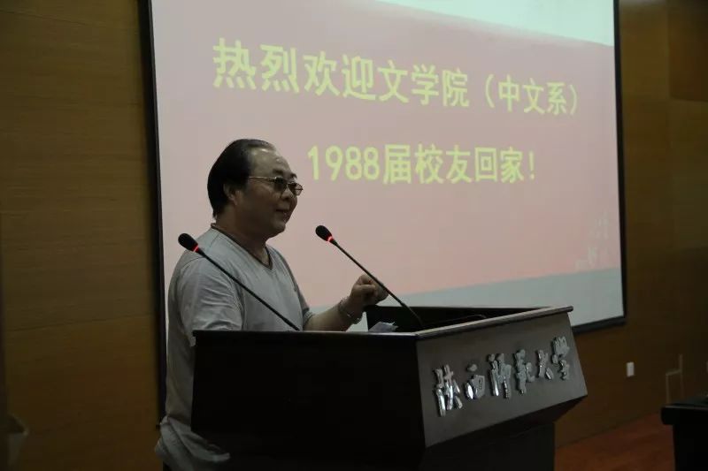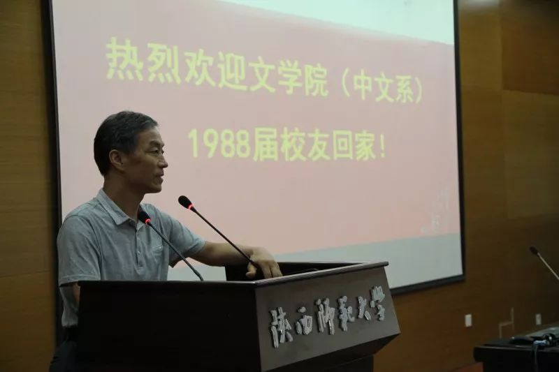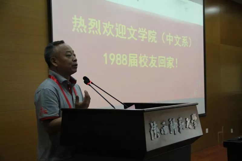 学生代表发言完毕后,到会教师代表讲话。时任中文系党总支副书记傅功振用方言亲切地叮嘱学生爱“我”、爱家、爱国。爱“我”就是爱自己,爱惜自己的身体。爱家一方面要爱护自己的家庭,好好地做爸爸妈妈、爷爷奶奶。另一方面要爱单位,爱岗敬业,团结友善。最后,要爱国,坚持古来君子的“修身、齐家、治国、平天下”的操守,先天下之忧而忧。时任中文系1988届辅导员魏建林也表达了对在场同学和过去共度的时光的怀念。他仍然像许多年前做过的那样,在台上殷切叮嘱他年逾半百的学生们注意防暑,保护好身体。琐碎之辞,更加温暖。最后,李彦宏老师上台讲话。李老师肯定了1988届学生在毕业三十年来在各行各业取得的成就,信手拈来诸多诗作,表达对同学们的祝福。