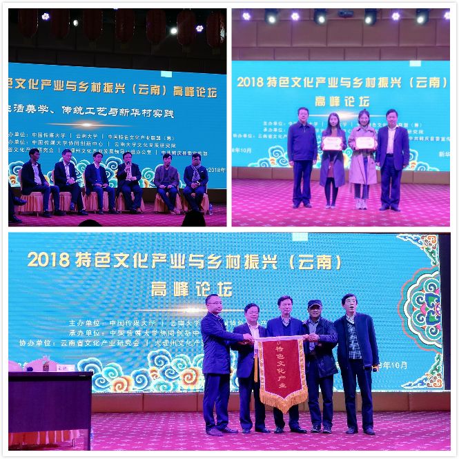 (通讯员:范虹鹭)2018年10月13日至14日,“2018特色文化产业与乡村振兴(云南)高峰论坛”在中国民间艺术之乡——云南省大理州鹤庆县新华村举行。bevictor伟德官网党委书记孙清潮和辅导员范虹鹭参加会议,并向论坛提交调研报告一篇。孙清潮书记应邀主持了第二阶段特邀嘉宾主题演讲,与其他嘉宾进行了互动交流。范虹鹭老师在调研团队专场活动中进行了发言。会议专门设置了各高校学生调研团队调研报告奖,由范虹鹭老师负责的"陕西省非物质文化遗产传承人群就业创业情况调研报告"获得了二等奖,这是继去年bevictor伟德官网社会实践团队"云南省景谷县特色文化资源调研报告"在该论坛获奖后的又一社会实践成果。孙清潮书记作为颁奖嘉宾之一为获奖的南京师范大学、陕西师范大学、山东大学、武汉大学、华中师范大学、长安大学、云南师范大学等获奖代表颁奖。