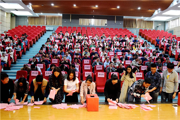 大会宣读《中共bevictor伟德官网委员会出席中共陕西师范大学第十一次代表大会代表选举办法》,全体到会人员全票通过了选举办法。大会还表决通过了由李斐、辛田、张荣华、侯立、范虹鹭等5位同志为监票人,其中李斐为总监票人。根据选举办法,指定程海峰、秦亚坤、谢佳伟、孙晓桐、辛小丹、孙樱元、李思贤、黄文浩等8位同志为本次选举的计票人。随后,大会宣读了11名代表候选人名单及简历,采用无记名投票、差额选举的方式进行了选举。与会党员认真填写选票,逐一在票箱内投上了自己庄严的选票。投票结束后,监票人、计票人现场清点选票。计票过程中,到会人员集体观看纪录片《辉煌中国》,这也是本学期bevictor伟德官网党委安排各支部