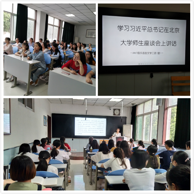 2016级本科生在辅导员范虹鹭老师的指导下,在教室开展主题班会、团日活动,在宿舍、自习室组织学习小组,对“习近平在北京大学师生座谈会上的讲话”进行学习。在汉语言文学一班班会上,有同学提出,作为师范生,应该身体力行,求知若渴,不断提高自己的教学能力,发挥自己作为青年大学生和未来教师的双重作用。发挥青年的主动性和创造力,为“一流学科”建设添砖加瓦。汉语言文学三班同学们在团日活动后积极表态,要担负历史使命和时代责任,勤奋好学,敢于担当,为国家社会主义现代化建设、为实现中华民族伟大复兴贡献力量。汉语言文学卓越教师实验班的同学谈到,“每一代青年都有自己的机遇,同学们应该趁年轻,追求青春理想”。“明德修身以报国,这是当代大学生应当秉持的信念,脚踏实地且勇于创新,这是当代大学生应有的品格,正如‘君子终日乾乾,夕惕若,厉,无咎’,我们应时刻准备着奋斗着,超越物质束缚,成为有价值的社会人”。汉语言文学基地班的同学表示,观看了“习近平总书记在北京大学师生座谈会上的讲话”之后,内心受到了很大震撼,就好像亲临现场一般,再次感受到了国家领导对当代青年的关爱,对人才的尊重。感到了“当代青年将是未来社会主义建设,实现中国梦的主体力量。作为大学生,一定不负众望,把个人的成长与国家的发展紧紧地联系在一起,为中国特色社会主义和中华民族的伟大复兴做出自己贡献”。汉语国际教育专业的同学谈到要珍惜时间,把握机会,努力成长为“不辱时代使命,不负人民期望”的社会主义建设者和接班人。一些同学还写下学习心得体会,向团支部汇报学习感想。
