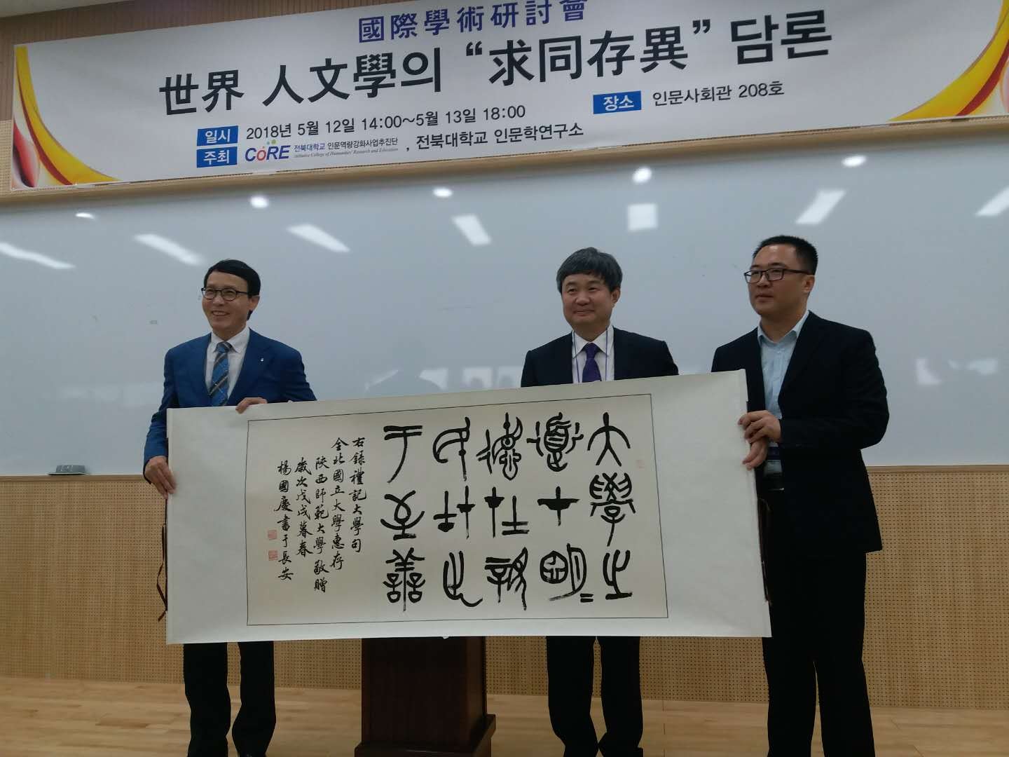 (通讯员:王伟)为进一步提升bevictor伟德官网学科建设与学术研究的国际化水准,促进一流学科建设的深入发展,2018年5月11日至15日,bevictor伟德官网苏仲乐、杨晓斌、王伟(古代文学)、周广干、王怀中、杨国庆等六位教师应邀前往韩国国立全北大学,参加由该校人bevictor伟德官网主办的“世界人文学‘求同存异’国际学术研讨会”。会议期间,苏仲乐教授代表bevictor伟德官网向全北大学人bevictor伟德官网赠送了书法作品,并受邀担任大会第三分科的主持人,六位老师按学科类别参与了各自小组的讨论,交流气氛热烈,相关成果引起会议代表的好评。