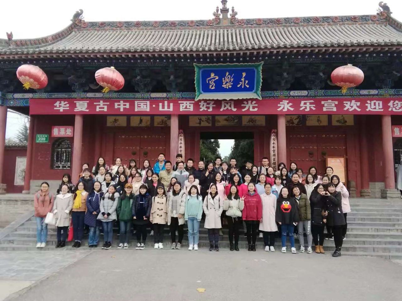 上午十时许,师生到达本次文化考察的第一个目的地——永乐宫。永乐宫始建于元代,因故址在永乐镇而得名,原址位于山西省芮城县永乐镇招贤村,现址位于芮城县城北3公里的龙泉村东侧。大家依次参观了现存的一门三殿,其建筑和壁画的艺术美使人震撼。首先越过无极门,映入眼帘的是三清殿,又称无极殿,是供“太清、玉属、上清元始天尊”的神堂,为永乐宫的主殿。面阔七间,深四间,八架椽,单檐五脊顶,殿内壁画高4.26米,全长94.68米,面积达403.34平方米,共有人物286个。其次是纯阳殿,又名混成殿、吕祖殿,殿宽五间,进深三间,八架椽,上覆单梁九脊琉璃屋顶。扇面墙后为《钟离权度吕洞宾图》,高3.7米,面积16平方米。最后是重阳殿,是为供奉道教全真派首领王重阳及其弟子“七真人”的殿宇,殿内出采用连环画形式描述了王重阳从降生到得道度化“七真人”成道的故事。每个大殿分别展示各自的的主题内容,从色彩到构图,每一处都让同学们深深感受到了其张扬出的元代宗教壁画的独特魅力。