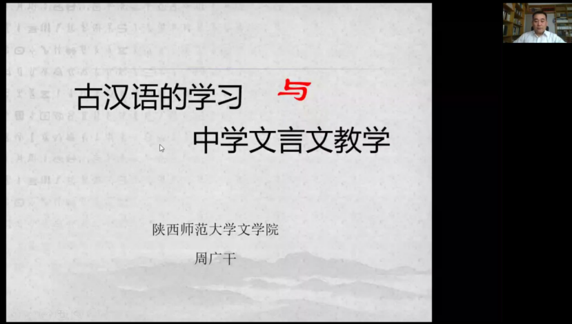 课程伊始,周广干老师提出学习古汉语是指导文言文教学的工具,也是一把开启中国古代典籍与古代文化宝库的钥匙。随后从五个方面进行了阐释:一是古文字与文言文教学,他从文字学基础理论出发,分别讲述了执简驭繁、因形求义的方法。二是古汉语词汇与文言文教学,他表示古汉语词汇是现代汉语的源头,强调要借古知今,了解古汉语词汇的内涵。三是古汉语语法与文言文教学,他表示语法是文言文教学的重点,涉及活用和词序等方面。四是音韵学与文言文教学,他表示音韵学在文言文教学中的体现主要为古今音变。五是古代文化常识与文言文教学,他运用许嘉璐《中国古代衣食住行》中的“语言是文化的最重要的载体,文化主要凝聚于词汇” 阐释了古代文化常识范围的广泛,表现在以词汇为载体,涉及到生活的各个方面。