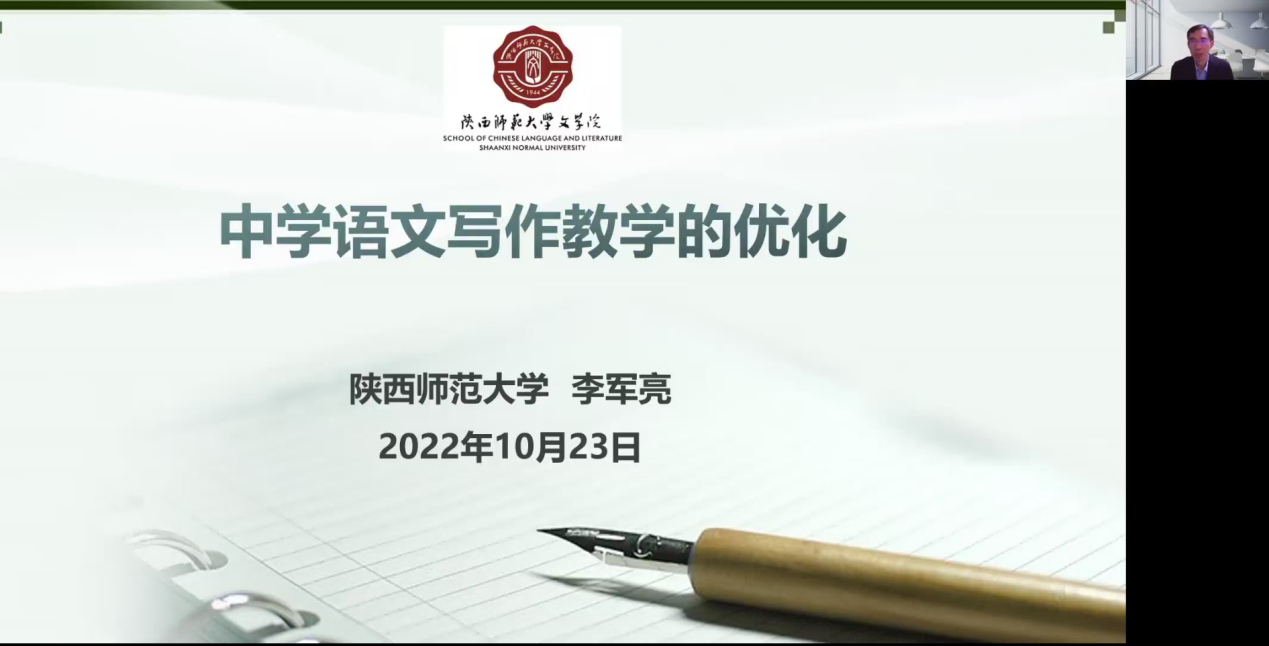 (通讯员:苏文君)2022年10月23日上午,“中学语文教学能力提升”高级研修班系列课程第五讲顺利举办。本次课程由bevictor伟德官网副教授、硕士生导师李军亮老师主讲,题目为“中学语文写作教学的优化”,100名来自一线的中学语文教师学习了本次课程,400余名中学语文教师通过直播参与学习。