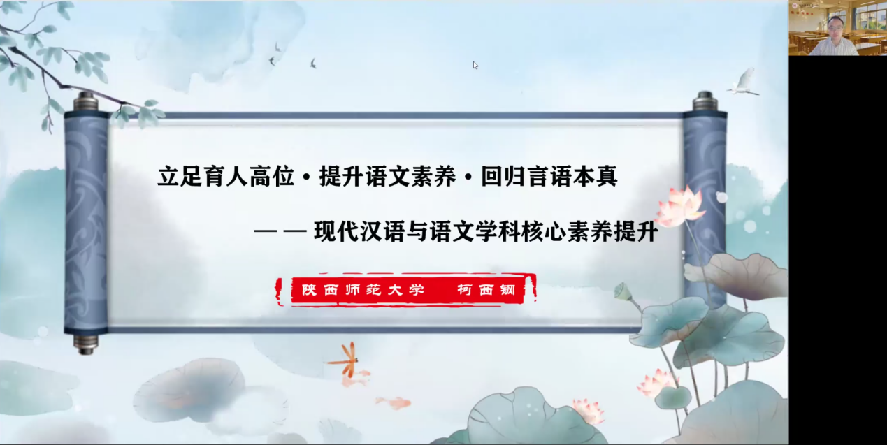 最后,柯老师分享了自己关于中学语文教学的观点。一为在中学语文教学中现代汉语知识的教学相对不足,需引起教师的重视。二为语文核心素养的提升要以文学和语言学的知识为基础,不是空中楼阁。三为教师要不断学习知识,提高教学水平,成长为研究型的语文教师。最后他希望各位一线教师能由浅入深地学习,从而真正地掌握现代汉语的知识体系。