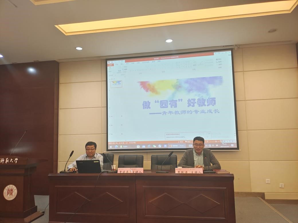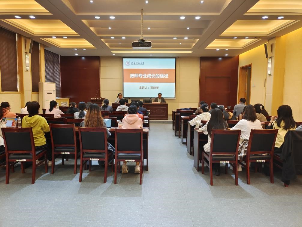 贾建英老师围绕语文教学与青年教师成长,讲述了如何成为有理想信念、有道德情操、有扎实学识、有仁爱之心的专业教师的路程。他指出专业教师要保持对职业的热爱与执着,认识到教育是让人幸福的事;要具有扎实的专业功底,坚持读书,研究优秀课例,提升专业素养。讲座最后,贾老师对年轻老师的课堂教学提出了宝贵建议,与同学们进行了亲切深入的交流与探讨。