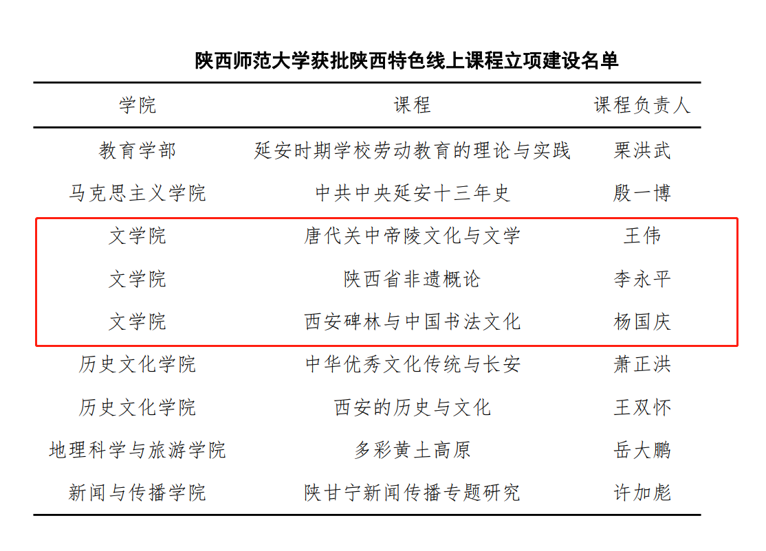 4月27日,陕西省教育厅办公室公布陕西特色线上课程立项建设名单,我校9门课程入选,其中bevictor伟德官网3门课程入选,分别为王伟教授负责的课程“唐代关中帝陵文化与文学”、李永平教授负责的课程“陕西省非遗概论”和杨国庆老师负责的课程“西安碑林与中国书法文化”。