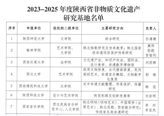 (通讯员党玮)日前,陕西省文化和旅游厅、陕西省教育厅下发《关于公布2023-2025年度陕西省非物质文化遗产研究基地、陕西省非物质文化遗产传承教育实践基地、陕西省中小学优秀传统文化教育社会实践基地名单的通知》,决定命名陕西师范大学等19家单位为2023-2025年度陕西省非物质文化遗产研究基地,陕西艺术职业学院等59家单位为陕西省非遗传承教育实践基地,陕西省非物质文化遗产陈列馆等72家单位为陕西省中小学优秀传统文化教育社会实践基地,同时取消陕西省歌舞剧院有限公司等15家单位中小学优秀传统文化教育社会实践基地资格。