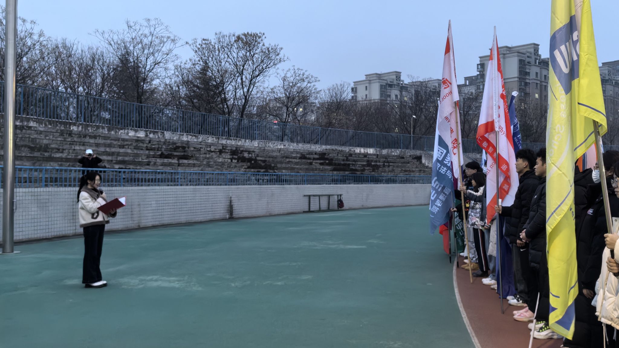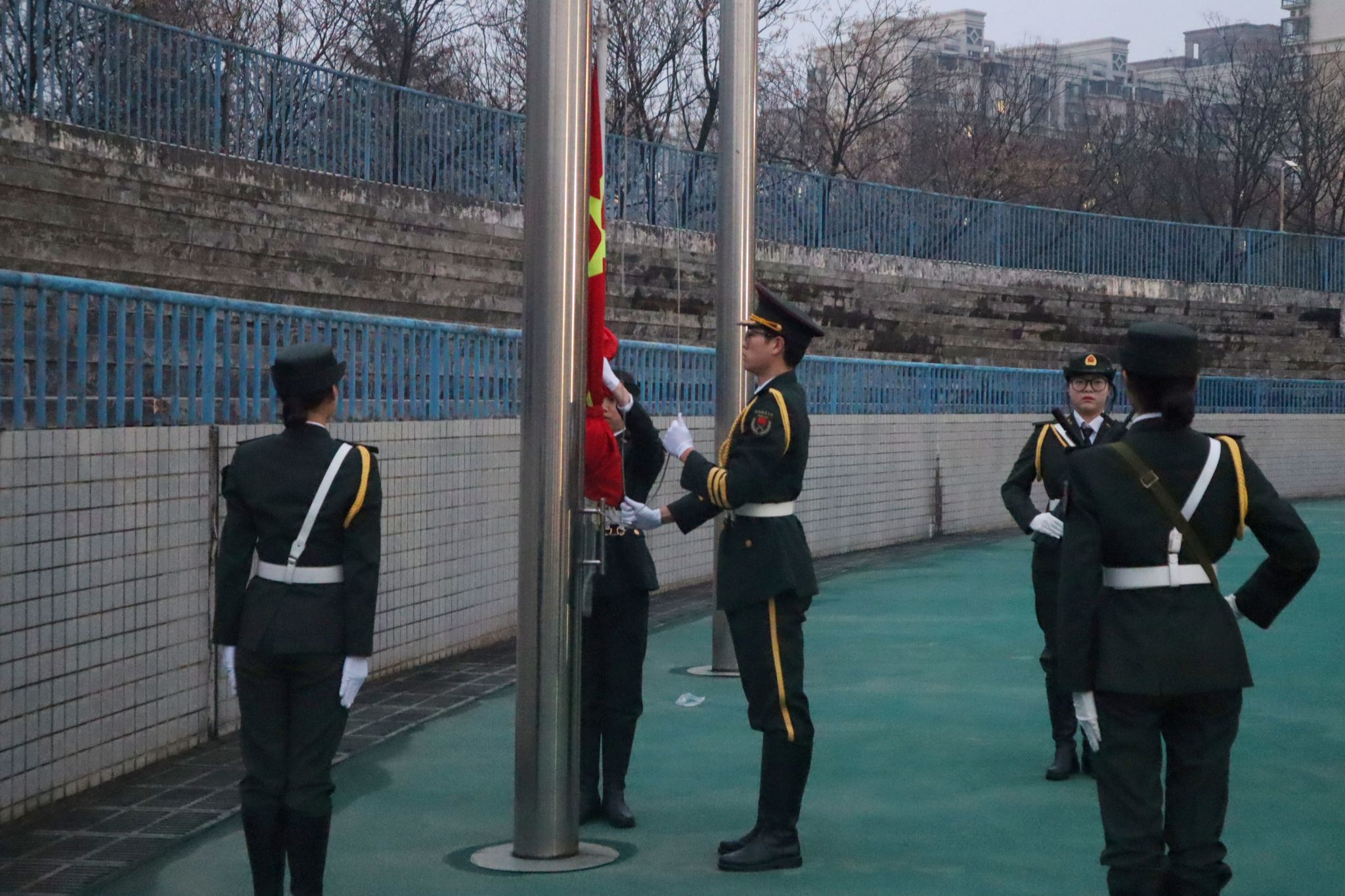 黎明破晓,国旗护卫队的同学们迈着铿锵有力的步伐而来。伴随着激昂雄壮的《义勇军进行曲》,五星红旗冉冉升起,全体人员行注目礼,齐声唱响国歌。