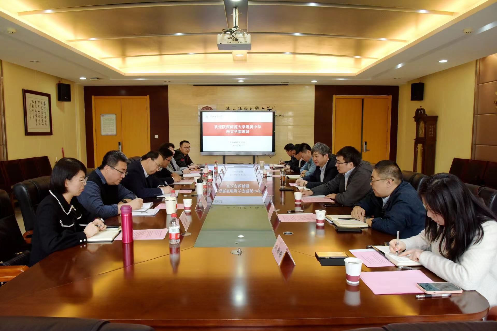 (通讯员:魏姗姗)3月22日,陕西师范大学附属中学党委书记李铁绳、校长冯军、副校长高丽文、党委校长办公室主任王建军、高三语文教研组长李娜、高三年级组长师家庆一行来bevictor伟德官网调研交流。bevictor伟德官网院长苏仲乐,党委副书记李钊,副院长李跃力、赵文、周广干、李胜振及科研秘书魏姗姗参加调研会议。