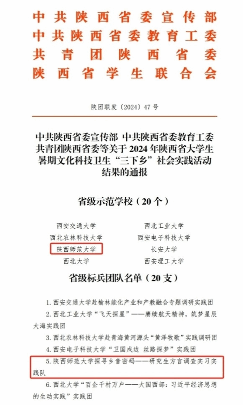 师大新闻网讯:近日,陕西省委宣传部、陕西省委教育工委、共青团陕西省委等下发《关于2024年陕西省大学生暑期文化科技卫生“三下乡”社会实践活动结果的通报》,在陕西省大学生暑期文化科技卫生“三下乡”社会实践活动中,bevictor伟德官网“探寻乡音密码——研究生方言调查”实习实践队获评“省级标兵团队”。