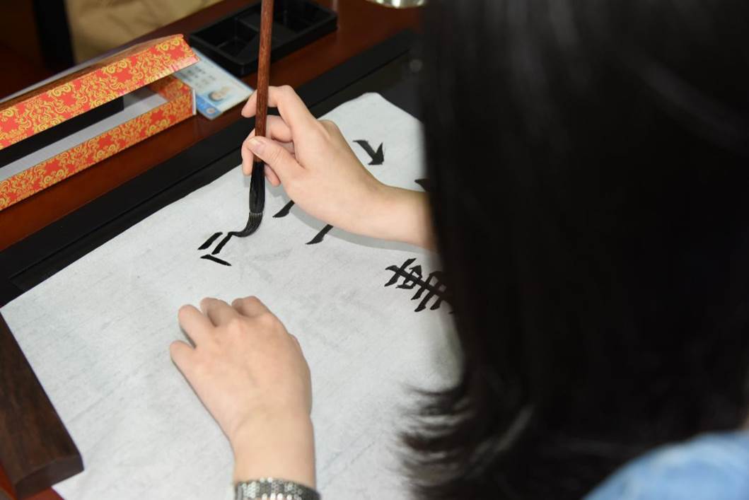 书法实训系统全面兼容教育部审核通过的11套书法教材,由交互式数字临摹台、教师中控、书法直播、字帖排版、视频资源库、板书示范、云平台管理等10多套系统构成。图为学生使用近照。