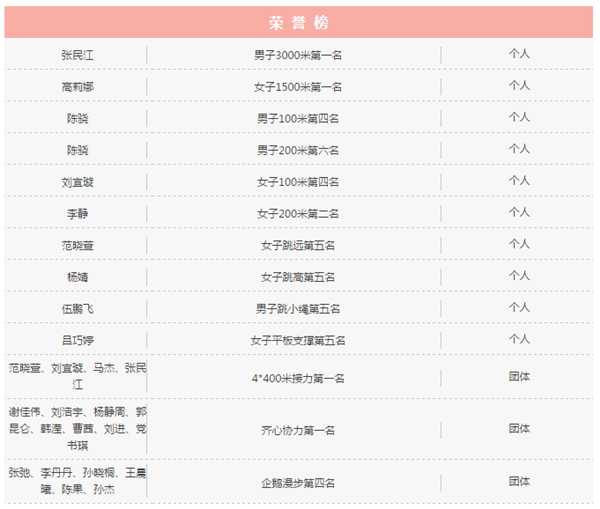 在上午进行的各项目中,面对激烈的竞争,健儿们全力投入、顽强拼搏,荣获4*400米接力第一名、男子3000米第一名、女子1500米第一名、男子100米第四名、男子200米第六名、女子100米第四名、女子200米第二名、女子跳远第五名、女子跳高第五名等奖项。
