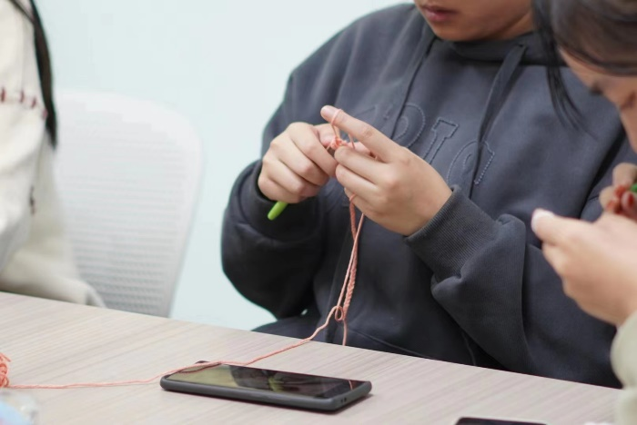 立冬时节,“情寄丝绒,共织暖冬”主题活动如期而至,我们见证了一团团色彩缤纷的毛线在同学们灵巧的手指上蹁跹而舞,变幻为一条情谊满满、抵御寒风的围巾;一朵风格迥异、构思精巧的花朵;一个小巧别致、精美实用的发卡。每一次起针到每一次锁边,随着轻盈的针织,同学们舒展紧绷的神经,由内而外地让身心彻底放松下来。时间缓缓流淌,初冬也因丝线紧绕汇聚在一起而变得温暖。