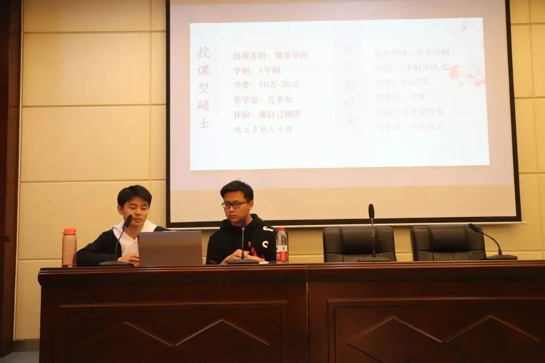 王沛杰重点向同学们介绍香港授课型硕士的基本情况、主要的申港学校以及相关专业。赵旭聪着重分享留学项目申请的经验,围绕留学前期准备、申请流程、申请专业三个方面做介绍,其中前期准备涉及必修课成绩、实习经历、英语口语等方面。他认为,必修课的成绩与绩点是前期准备的重中之重,实习经历是锦上添花,同学们应注意各方面的平衡。