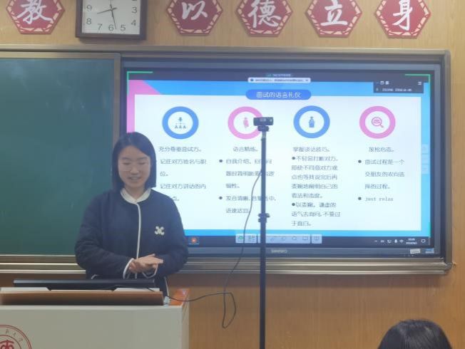 崔颖戈从求职面试的仪容、举止和语言三方面出发,表示要根据自己的求职定位选择服装和妆容,表现出有教养、职业化的面貌。举止大方友善,从容自得,注重面试语言的精炼。