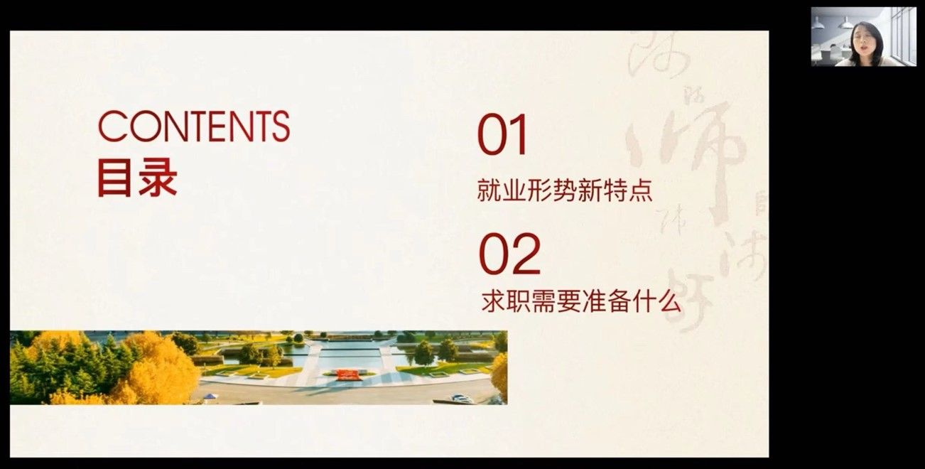 张蕾老师围绕“就业形势新特点”和“求职需要准备什么”两个方面展开课程。基于当前大学生工作形式多样化的现状,张蕾介绍了大学生就业难的四大主因,分析了毕业生的求职期待,结合学院往届研究生毕业生的就业情况,为同学们梳理出了“就业形势新特点”,概括了宏观的就业情况。围绕“求职需要准备什么”,张蕾介绍了校园招聘周期以及各个时间节点应完成的事项;针对部分研究生在求职或竞争中“无目的”“无竞争力”“无方法”的问题,分别给出解决方法。张蕾对求职简历的逻辑架构作出详细指导,并鼓励同学们注意求职过程中的心理调适。