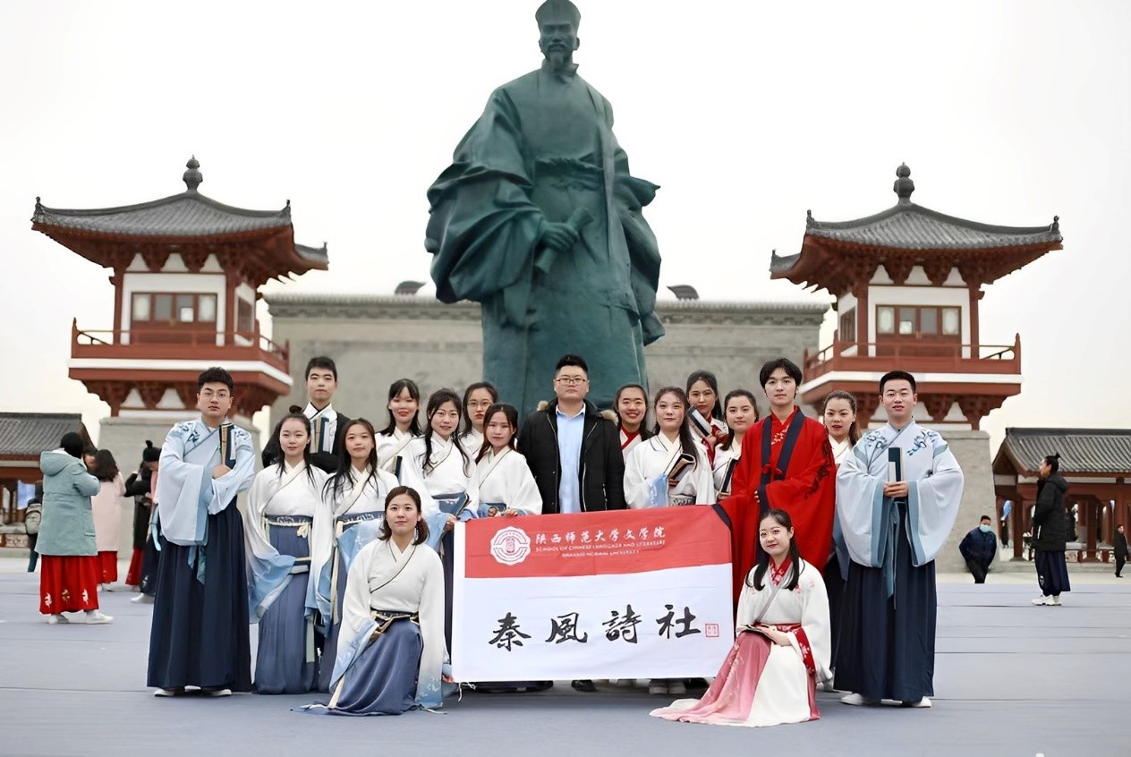 秦风诗社成立于2012年,以“体会诗词之美,推广传统文化”为宗旨,坚守校园文化阵地,传承吟诵艺术气质。在校内,诗社每周定期在长安、雁塔校区展开吟诵教学,定期参加每年的迎新晚会以及中华好诗词竞赛展演。在校外,2018年,诗社成员在共青团中央的号召下开展以“吟诵促推普,传统入新言”为主题的社会实践活动,助力推普脱贫攻坚战;2020年,诗社作为陕西省高校学生代表受邀参加“纪念张载诞辰1000周年—横渠书院开幕仪式”。先后获评2017-2018年陕西师范大学“共青团员先锋岗”、陕西师范大学十佳社团、全国优秀大学生国学社团等荣誉称号,成为bevictor伟德官网对外一张别具特色的名片。