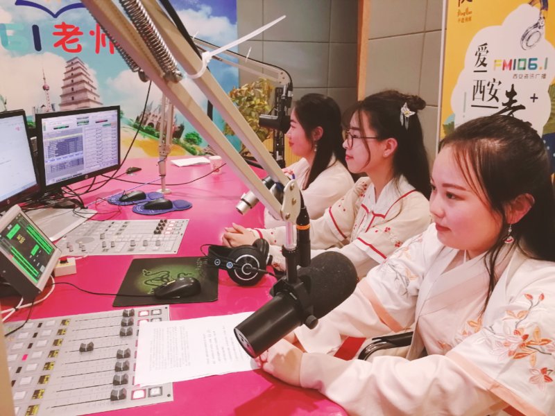 上午11:40:,阳光温热,惠风和煦。秦风诗社社长田雨鑫以及社员周倩、王菁华一行三人如约到达位于曲江池西路的西安广播电视台。在节目开始之前,同主持人热情地进行了交谈,包括诗社概况的介绍,此次广播节目的类型、特点以及要求等。初次到访,诗社也为广播电台带来了小礼物留作纪念。之后便在“好好学习巷”栏目主持人晗冰和老冰的带领下,进入了直播间做准备。