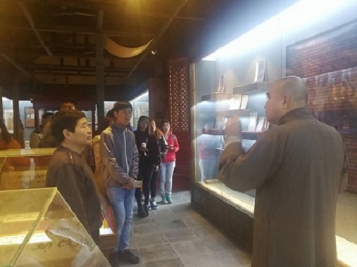 香积寺住持在寺院的甬道欢迎了师生一行,并专门安排一位僧人带领大家步入“香积寺佛教文化展厅”参观。在这里,僧人首先对佛教作了概括的介绍。接着结合展厅内一件件古物、抄本佛经、佛画,分别从净土宗的起源、创始人之一善导大师的修行,以及建寺以来的重要事件,比较详细地解说了净土宗的基本内容和形成过程。其中讲到"放下屠刀,立地成佛"的典故时,大家更是有一种恍然大悟的感觉。以朱鸿老师的建议,这个僧人还坦诚地回答了同学们提出的几个问题,使大家从一个难得的角度了解了佛教徒的人生。