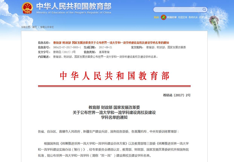 9月20日,教育部、财政部、国家发展改革委印发《关于公布世界一流大学和一流学科建设高校及建设学科名单的通知》,公布世界一流大学和一流学科(简称“双一流”)建设高校及建设学科名单。