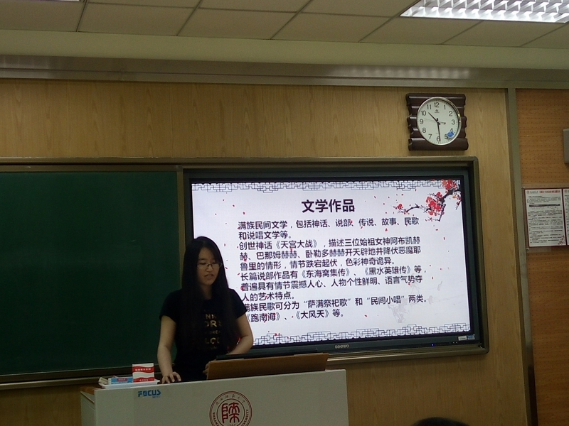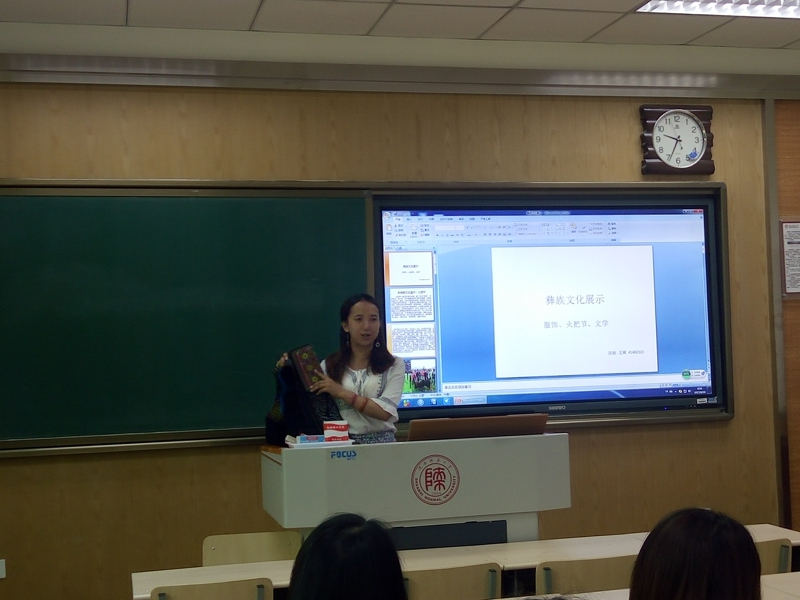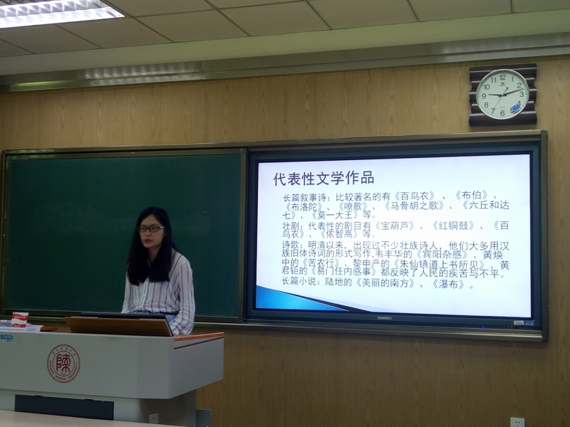 经过精心准备,活动在同学们热情参与中开始了。首先,汉语言文学2班的杨家宾同学为大家普及了有关白族和大理的文学作品与文化遗产,让大家不仅看到了苍山洱海的自然风光,还领略到了她在历史进程中沉淀下来的人文财富;随后,汉语言创新班的王斌同学将大家带进了四川的凉山彝寨,大家欣赏了火把节的盛况,也学习了彝族繁复的文字与优美的民谣;接着,汉语言文学2班和3班的李俏与梁晓莲同学更是跨班合作,为大家展示了能歌善舞的壮族的古老神话,让大家感受到了追逐太阳的民族的那份执着……