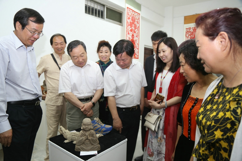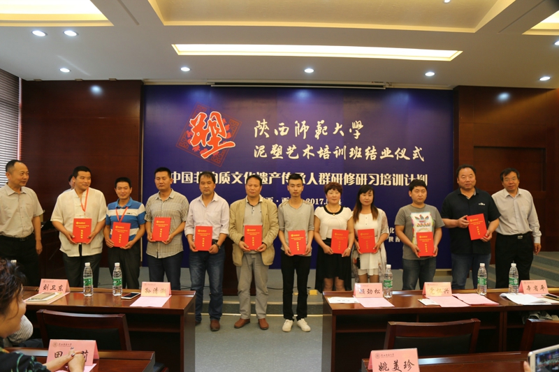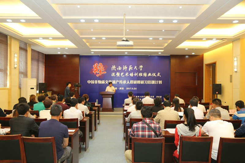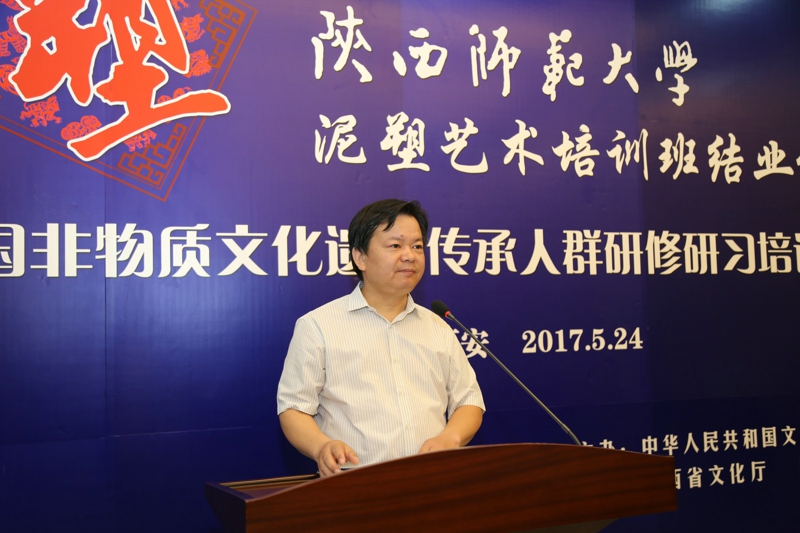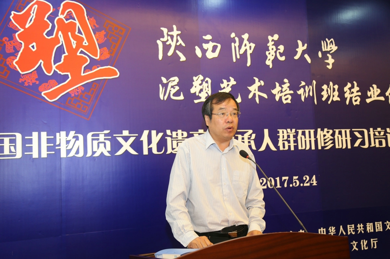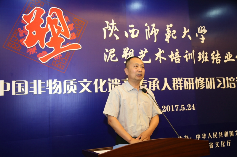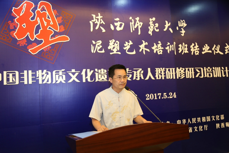 2017年5月24日,文化部教育部中国非物质文化遗产传承人群研修研习培训计划(以下简称“研培计划”)陕西师范大学第五期培训班(泥塑)结业仪式暨学员结业作品展览在长安校区隆重举行。陕西省文化厅副厅长顾劲松、非物质文化遗产处副处长刘卫东,陕西师范大学副校长党怀兴等参观了学员们的结业作品展览,并出席结业仪式,同时向学员们颁发了结业证书,向优秀学员颁发了获奖证书。结业仪式结束后,陕西师范大学党委书记甘晖,在党怀兴副校长、校办主任马晓云等陪同下,前往学员结业作品展室,观看学员结业作品展并与本期部分学员和往期特邀学员交谈。