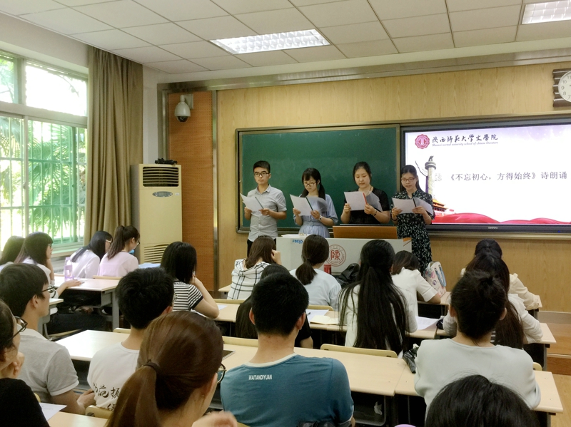 2016级研究生任杰、张瑞雪、樊月、裴潇雅四位同学为大家带来诗朗诵《不忘初心,方得始终》,他们激情慷慨的声音传递出坚定的信念,意气风发的神情表达了执着的追求。