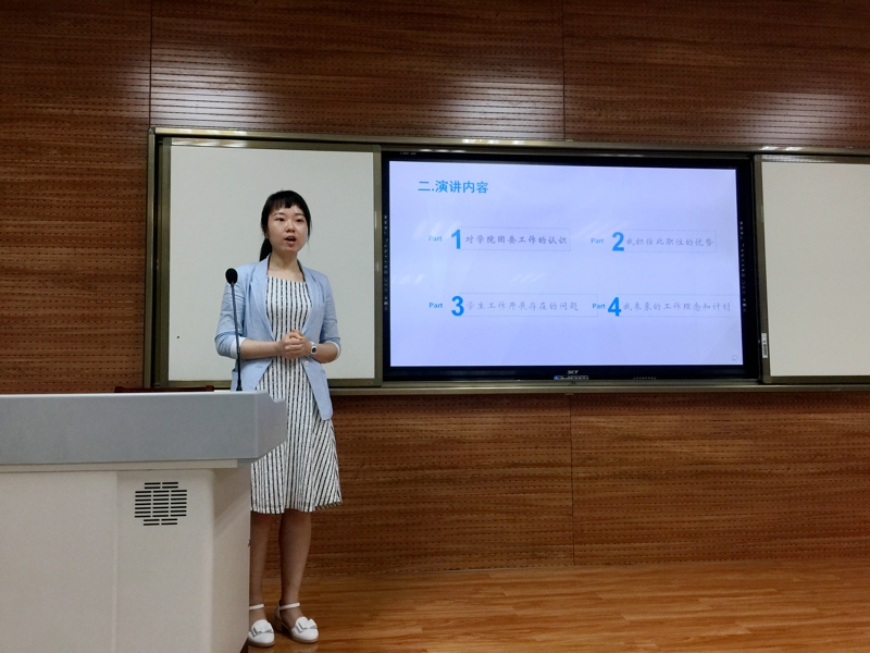 5月中旬,bevictor伟德官网团委发布公开选聘院研究生会主要干部的通知,按照“优化结构、公平民主、公正公开”的原则,经过个人自荐、资格审查,近20位同学进入陈述答辩环节。在答辩开始之前,bevictor伟德官网团委书记辛田对此次答辩的目的、要求和流程进行了简要介绍。随后,各位同学按照抽签顺序上台答辩,从个人任职经历、特长、工作理念、工作预想等方面做了展示。评委根据每个同学的具体情况有针对性地提出问题,进一步考察了同学们的应变能力。