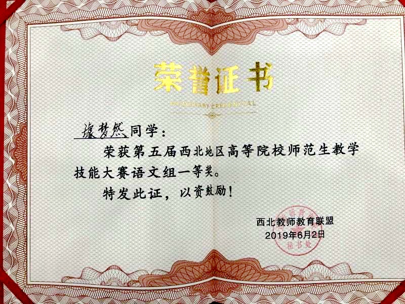 (通讯员:李军亮)5月31日至6月2日,第五届西北地区高等院校师范生教学技能大赛在陕西咸阳举办,我院2016级汉语言文学(师范)专业璩梦然同学代表学校参加了比赛,并荣获语文组一等奖。一等奖为比赛最高奖项,每学科仅有2名选手获得。