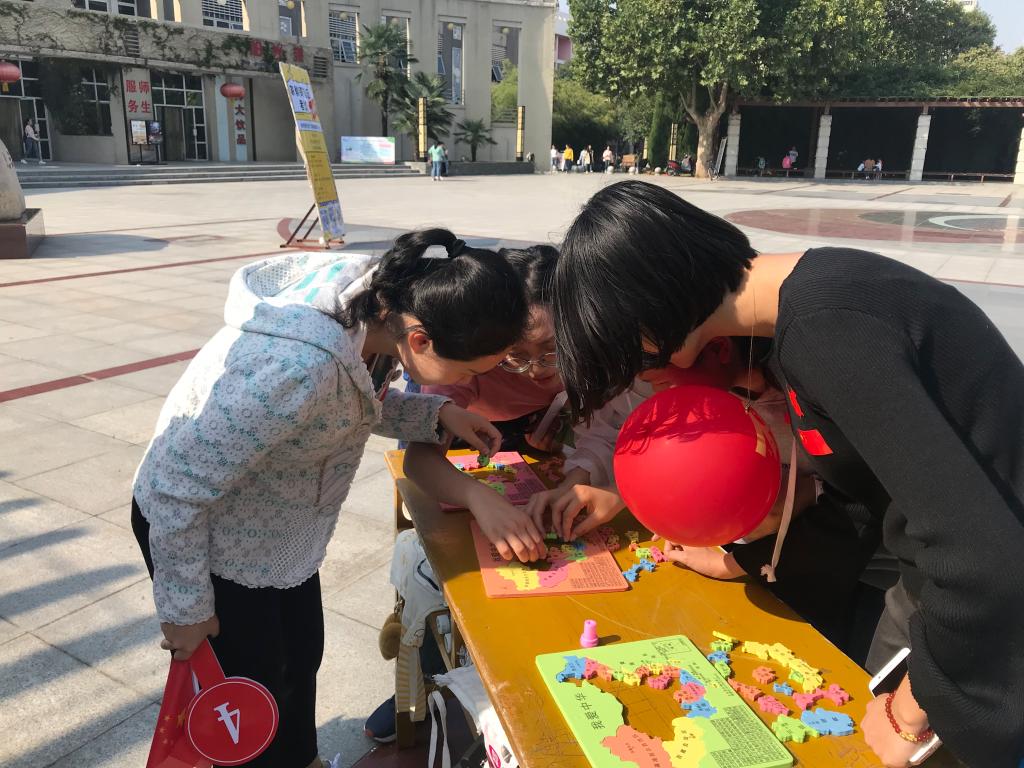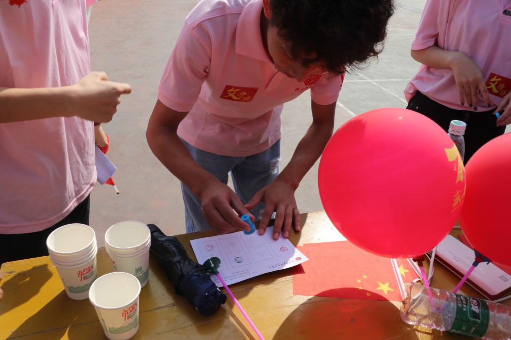 本次比赛分别在图书馆、孔子像、上林体育馆、新勇活动中心等8个标志性校园建筑设置项目点,开展了内容丰富、形式多样的打卡活动。飞花令展现文苑诗词魅力,定点投篮挑战篮球掷准,乒乓球接力考验传递平衡,知识竞赛回顾祖国历程,团结协作印证合作力量,你画我猜体现成员默契,拼地图熟悉祖国河山,最短反射弧测试手口协调。同学们在抽签后,按照地图顺序,全部打卡即可通关。