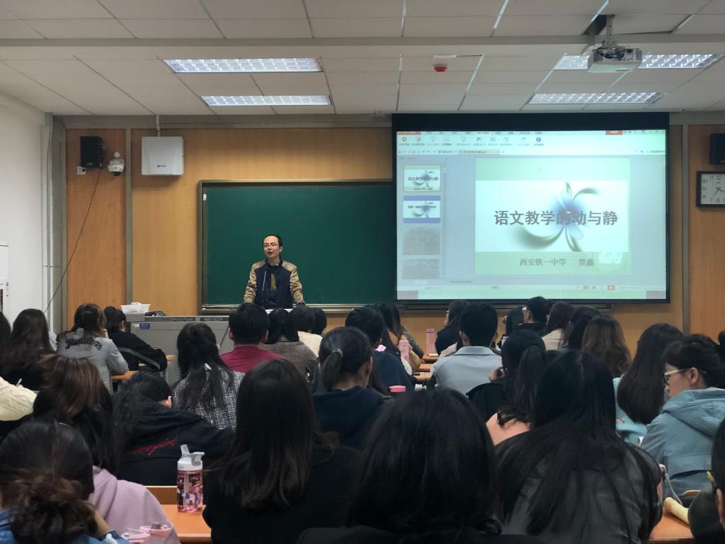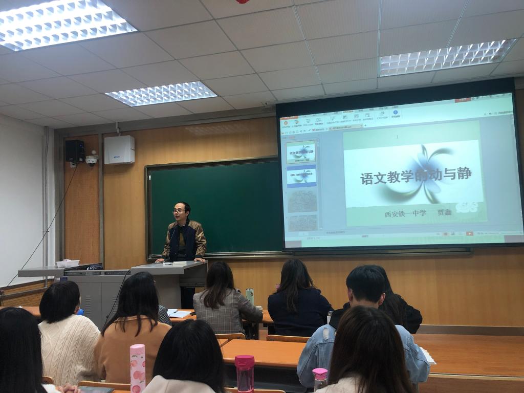 本次"文心"语文名师大讲堂第四讲邀请到了西安铁一中高中部语文备课组长,碑林区、西安市、陕西省教学能手,全国语文教学技能大赛一等奖获得者贾鑫老师。贾鑫老师以“语文教学的动与静”为主题,围绕语文课堂当中教学活动的开展,与同学们探讨了语文活动教学的几个误区和应对策略。
