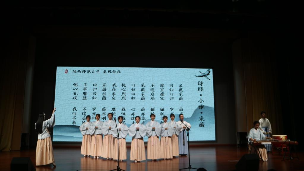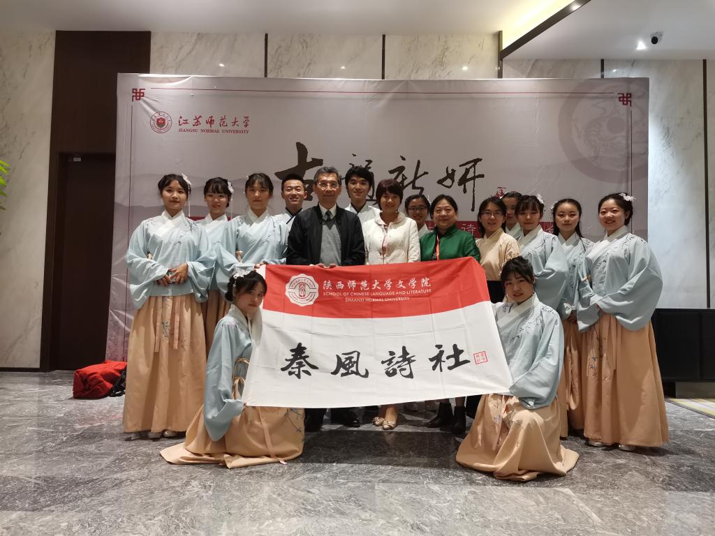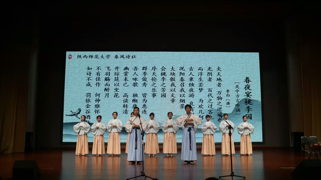 22日下午六时,联吟展演在江苏师范大学马可音乐厅举行。南北相会、两岸齐聚,来自海峡两岸的13个诗社用36首经典诗篇的吟诵,共同打造出一场吟诵盛宴。bevictor伟德官网秦风诗社以《春夜宴桃李园序》和《诗经·小雅·采薇》两首篇目压轴出场。“桃李会,俊秀集”,在《春夜宴桃李园序》中,洒脱的关中方言吟诵配以精心编排的情景剧,极尽太白举宴的潇洒之态,充分展现出秦地豪情;“昔我往矣,杨柳依依,今我来思,雨雪霏霏。”《诗经·小雅·采薇》则以独特的队形变换,鼓点和古筝的相互配合,来表现诗文情感,令人耳目一新。最后,大会在两岸师生深情吟唱的“古韵新妍”经典保留篇目《蓼莪》中落下帷幕。活动举办期间,bevictor伟德官网师生还参加了汉文化训练营。