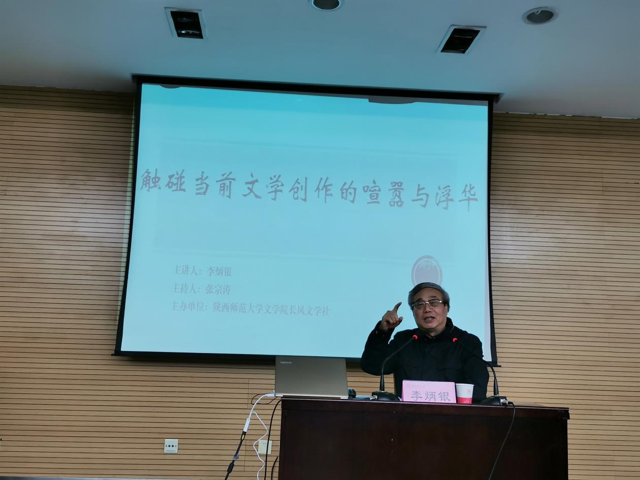 (通讯员:文苑)11月12日晚,中国作家协会报告文学专委会副主任、中国报告文学学会副会长、《时代报告:中国报告文学》杂志主编李炳银先生应邀来bevictor伟德官网,以《触撞当前文学创作的喧嚣与浮华》为题作了精彩的专题报告。来自陕西省作协、陕西省写作学会、陕西省化工作协、西安市高新管委会、陕西师大长风文学社、陕西师大bevictor伟德官网各年级同学,以及各兄弟院校文学爱好者130余人参加了报告会。