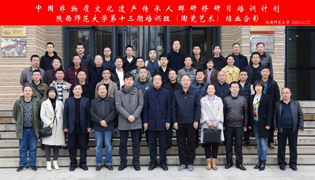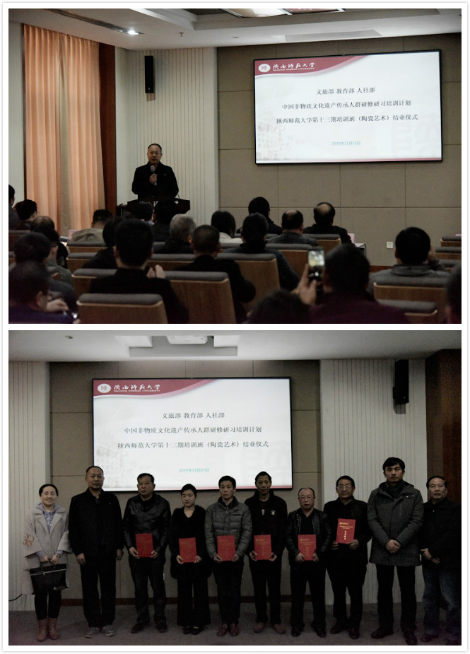(通讯员 陈丹玉)2019年11月22日,文化和旅游部、教育部、人力资源和社会保障部中国非物质文化遗产传承人群研修研习培训计划(以下简称“研培计划”)陕西师范大学第十三期培训班(陶瓷艺术)结业仪式暨学员结业作品展览在长安校区隆重举行。陕西省文化和旅游厅副厅长顾劲松、非物质文化遗产处副调研员周颖,陕西师范大学副校长党怀兴等出席结业仪式并参观了学员的结业作品展览,同时向学员们颁发了结业证书,向优秀学员颁发了荣誉证书,共同观看了陕西师范大学“研培计划”就业创业先进学员微视频。