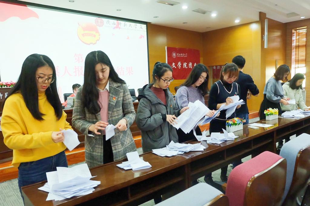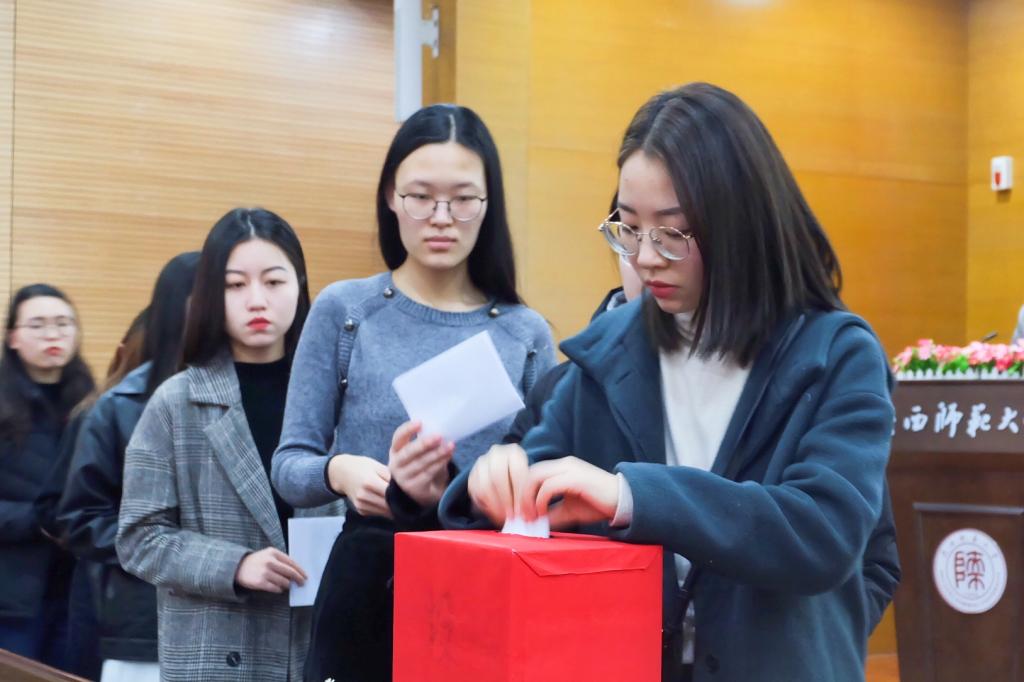 会上,bevictor伟德官网本科生兼职团委副书记李云洁宣读《共青团陕西师范大学第十四次代表大会选举办法》;表决通过张文贺为大会监票人,王娟、曾雯璐、郭新月、杨雨帆、李雅婧、王亚丽、张心宇等7位团员为计票人;bevictor伟德官网研究生兼职团委副书记马佩仪宣读26名代表候选人名单。随后,大会采用无记名投票、差额选举的方式进行了选举,与会团员代表认真填写选票,逐一在票箱投上了自己庄严的选票。投票结束后,监票人、计票人现场清点选票。