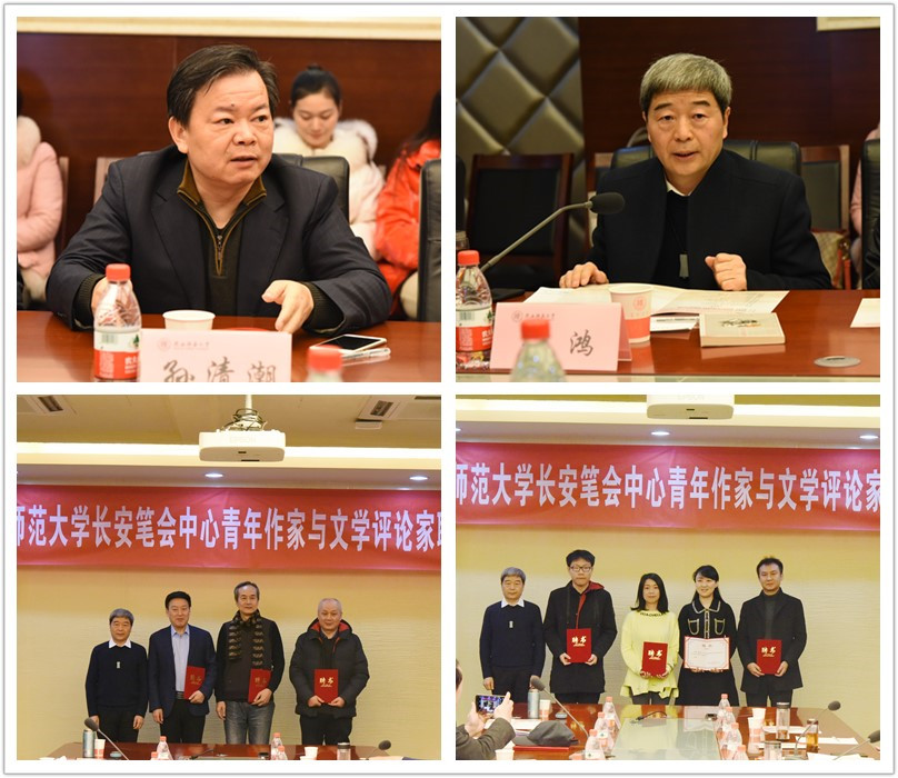 开幕式结束后,举行了青年作家与文学评论家聘任仪式。长安笔会中心主任朱鸿教授为刘炜评、刑小利、仵埂三位评论家以及高杨、温洁、马慧聪、毛阳等四位青年作家颁发聘书,并合影留念。