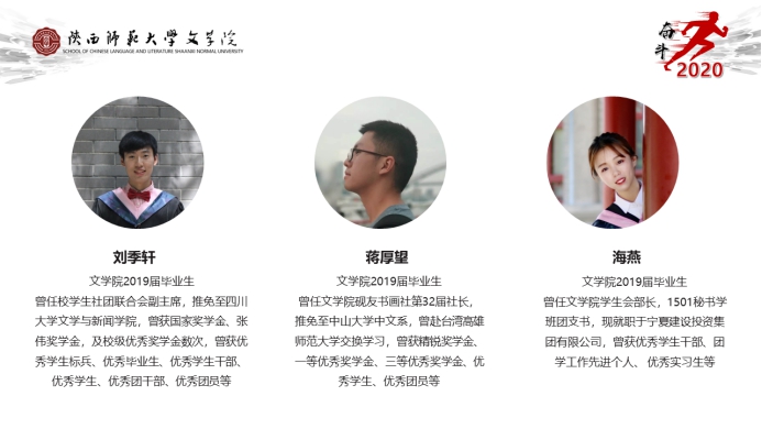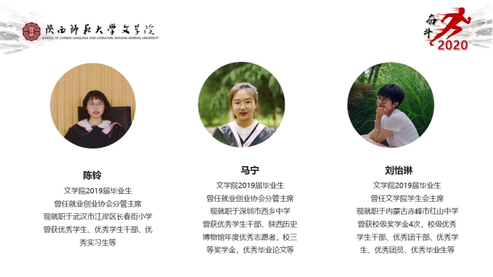 班会分为两场,3月14日晚,我院2019届毕业生陈铃、马宁、刘怡琳为汉语言文学(师范)专业学生进行经验分享。3月15日晚,我院2019届毕业生刘季轩、蒋厚望、海燕为中国语言文学类学生进行经验分享。