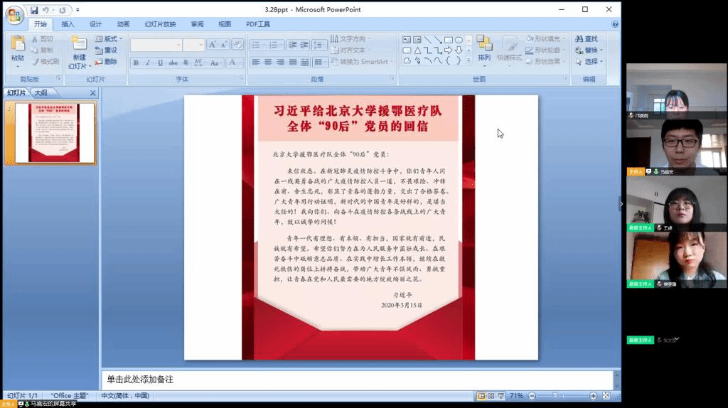 (通讯员:韩睿 曹楠 图片:袁芳 邝夏雨)3月28日上午10:00,bevictor伟德官网学生会通过“腾讯会议”线上举办《习近平总书记给北京大学援鄂医疗队“90后”党员重要回信》精神集体学习会。bevictor伟德官网党委副书记李斐、团委书记辛田,以及学生会全体成员参加会议。会议由学生会主席马嘉宏主持。