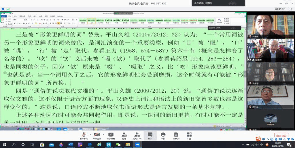 (通讯员:王淘)应bevictor伟德官网邀请,4月20日下午,浙江大学教育部重点研究基地汉语史研究中心主任汪维辉教授通过腾讯会议平台(会议号785387570)为bevictor伟德官网师生做了题为“常用词历时更替研究的工作程序”的学术讲座。讲座由黑维强教授主持,乔全生教授、邢向东教授点评,党怀兴副校长、赵学清、周广干等教师及语言学、文字学专业研究生共计130余人听取了讲座。